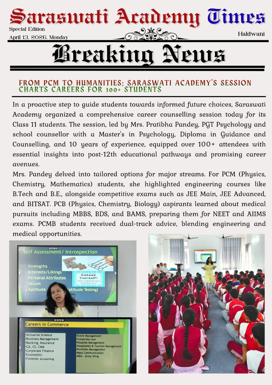 Career Counselling Session Empowers Class 11 Students at Saraswati Academy