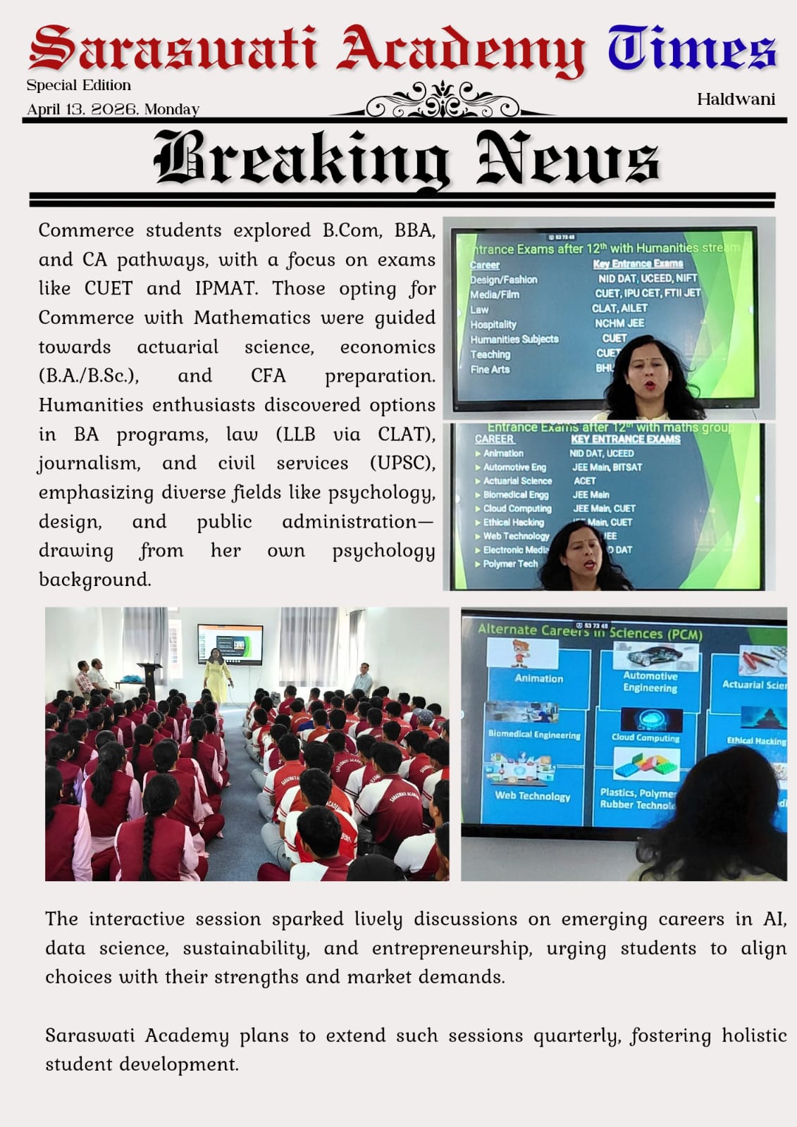 Parents and students lauded the practical advice. Saraswati Academy commits to quarterly sessions for holistic growth.